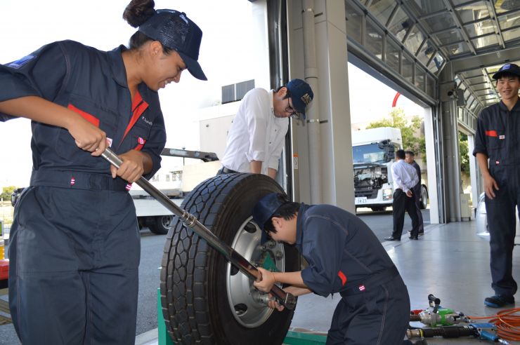 大型車用の電動パワートルクセッターやインパクトレンチ、トルクレンチを使い、締め付け作業なども体験させていただきました。ワークサポートスーツの体験も面白かったです。